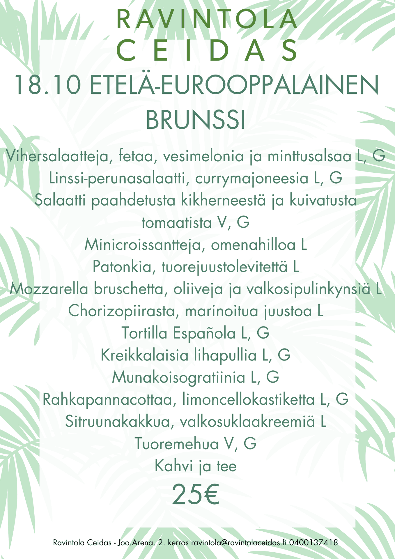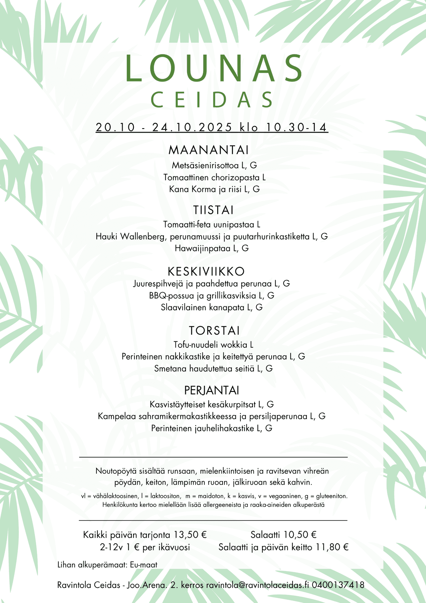 Ravintola Ceidas löytyy Masalan Joo.Arenan toisesta kerroksesta. Arenalla on runsaasti parkkitilaa ja Masalan juna-asemalta pääsee jalkaisin paikalle tuossa tuokiossa.